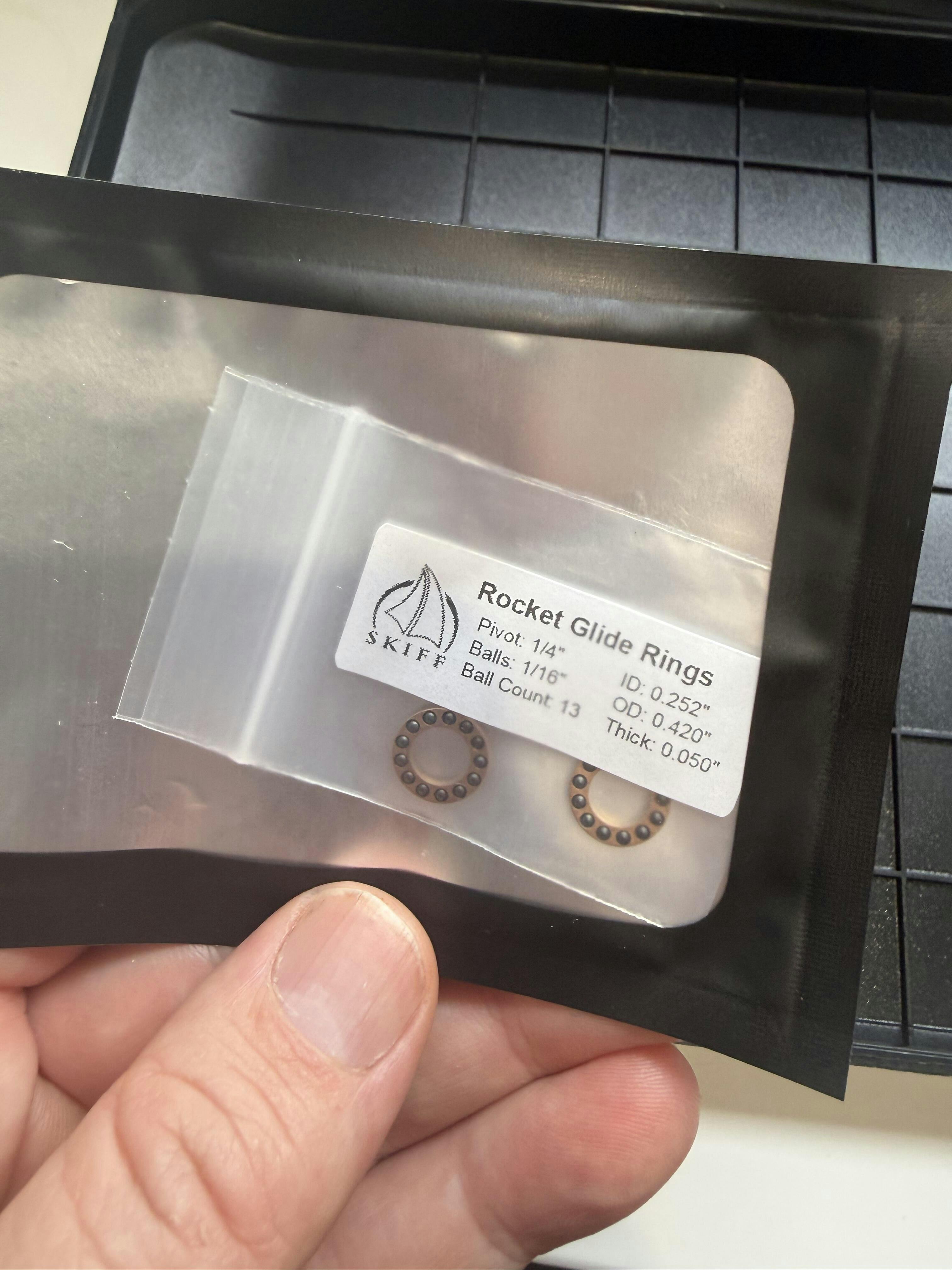 Skiff Cage bearings allow more balls to be placed around the knife pivot than stock/standard cage bearings. This provides more support for the blade, decreasing stress on each ball and in turn reducing friction. The ceramic balls are captured in the disc but are still free floating to prevent binding. Skiff Cage Bearings are an exceptional upgrade to your EDC knife.