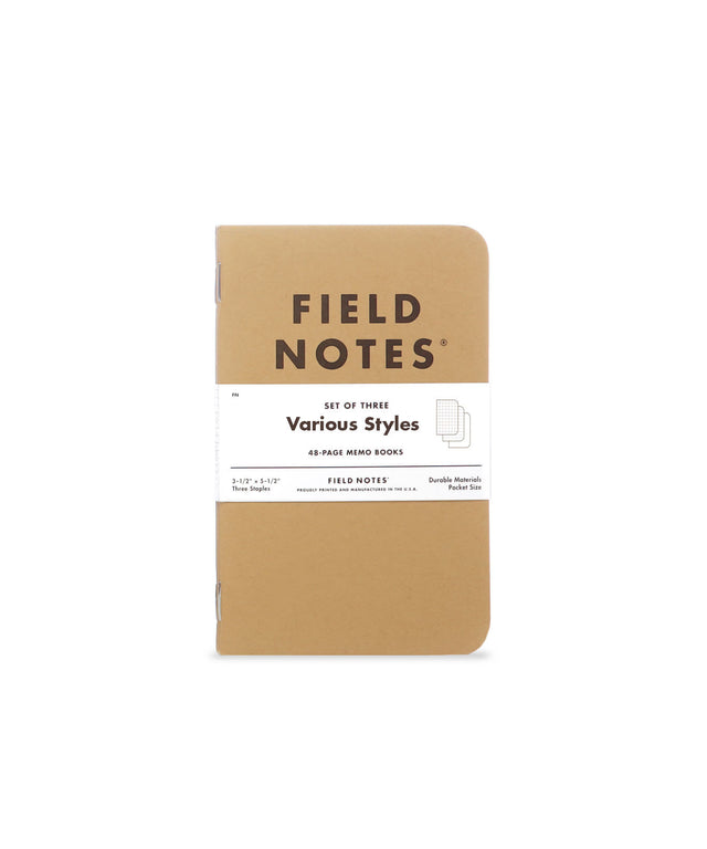 Field Notes original 48-page notebooks are available in three variations – graph, ruled, or plain paper – or as a mixed 3-pack that includes one of each paper type. Each Original Kraft memo book measures 3-1/2" wide by 5-1/2" tall (89mm x 140mm) and is bound by a rugged three-staple saddle-stitch process.