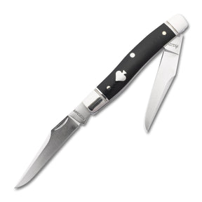 the handle features black Micarta covers, brushed steel bolsters, steel liners, and nickel silver pins, with a stainless steel Spade shield for a classic touch. At 3.88″ closed and 6.88″ open, this lightweight 96g design by Andy Armstrong blends tradition with modern craftsmanship.
