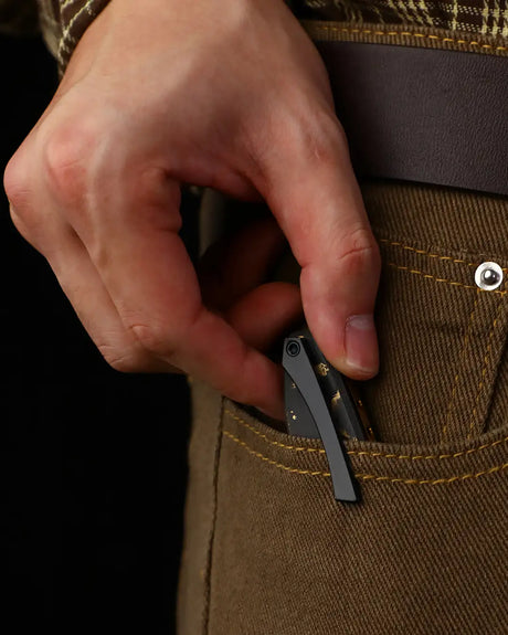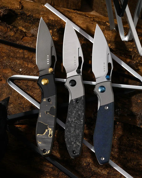 The Kizer Shrike by Johan Jordaan is a precision-built compact bolster lock folder featuring an S45VN drop point blade, titanium handles, and triple deployment system. Lightweight, sleek, and engineered for daily performance.