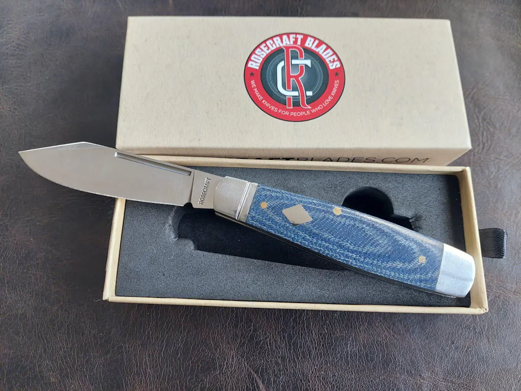 The Barren Fork Jack from RoseCraft Blades is a clean, classic square-end jack pattern with a modern steel upgrade. It’s inspired by an old NON-XLL pattern by Joseph Allen & Sons of Sheffield and reimagined by Andy Armstrong. It features a 2.9” 14C28N clip point blade with a brushed satin finish, bold swedging, a long pull, and a half-stop for that satisfying traditional walk-and-talk. Finished with Blue Denim Micarta covers, brushed stainless steel bolsters and liners, nickel silver pins, and the RoseCraft Diamond shield, it’s a classy pocket companion that feels timeless but built for everyday use. Measuring 92mm (3.62”) closed and 165mm overall, it stays light in the pocket at just 79g.