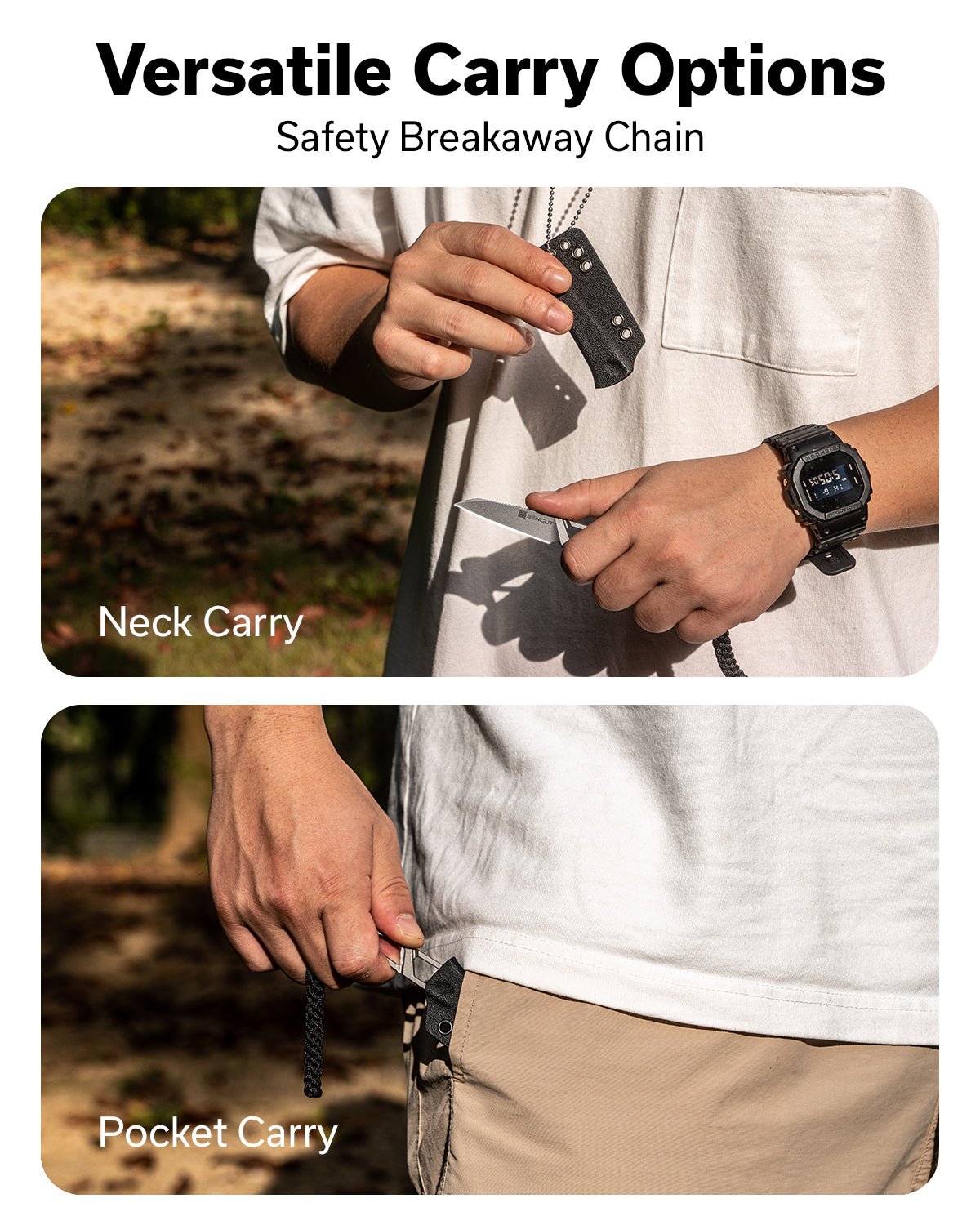 - Kydex sheath with breakaway chain – versatile carry options, secure and easy to access