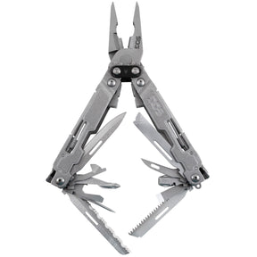 Features Compound Leverage plier heads for smooth open and close and increased gripping power. A total of 21 tools are on the heavy duty, stainless steel PowerAccess Deluxe including two knife blades, can & bottle opener, wood saw, two flat screwdrivers, Phillips screwdriver and a 1/4" driver with hex bit kit.
